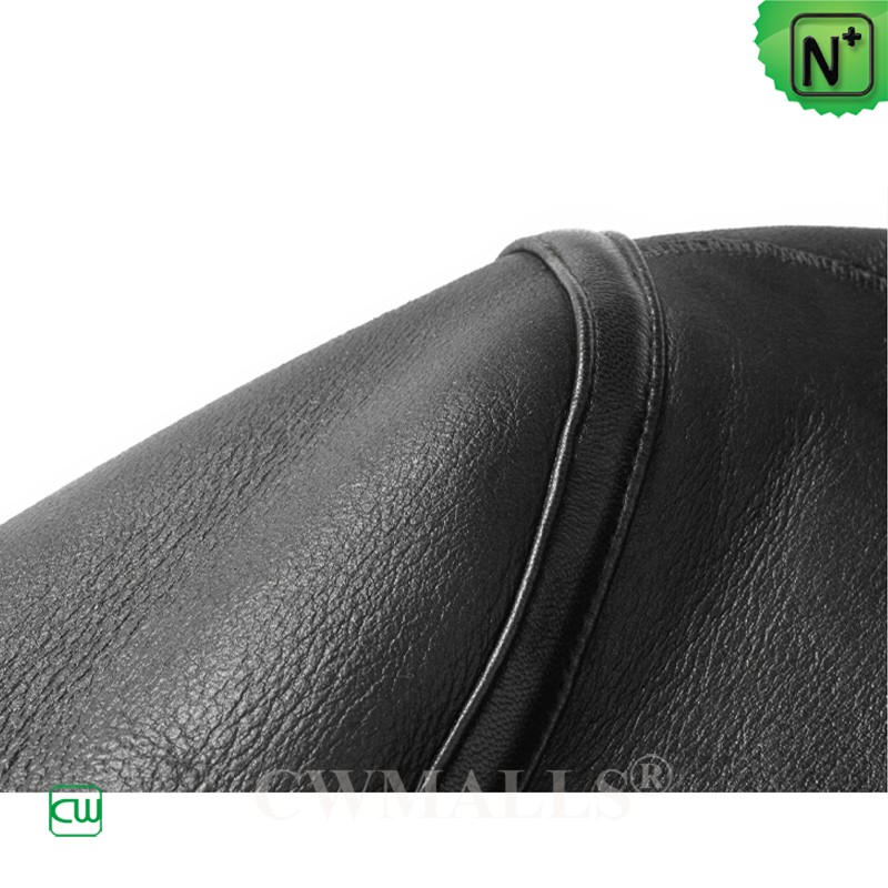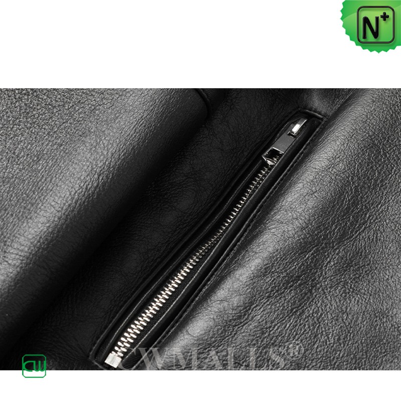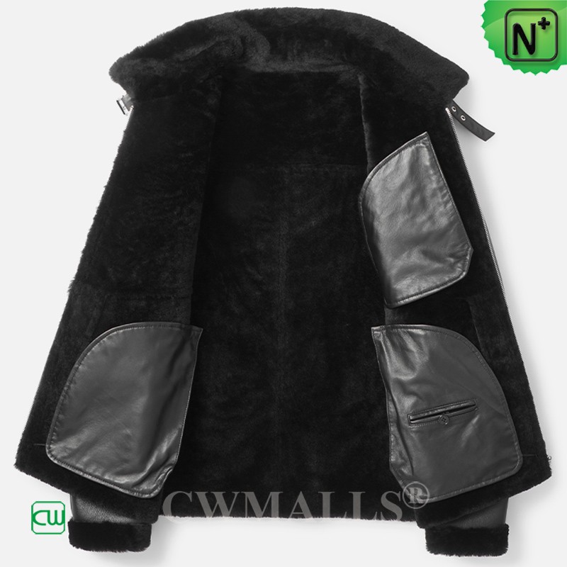 CWMALLS classic sheepskin B-3 bomber jacket crafted from natural plush sheepskin shearling in black color, featuring a buckle strap fasten the shearling stand collar, shearling trim bottom, a sturdy zip-front closure, a zip chest pocket, and two zipper hand pockets. This rugger sheepskin shearling bomber jacket provides combat-strength insulation from the elements for a cozy winter.