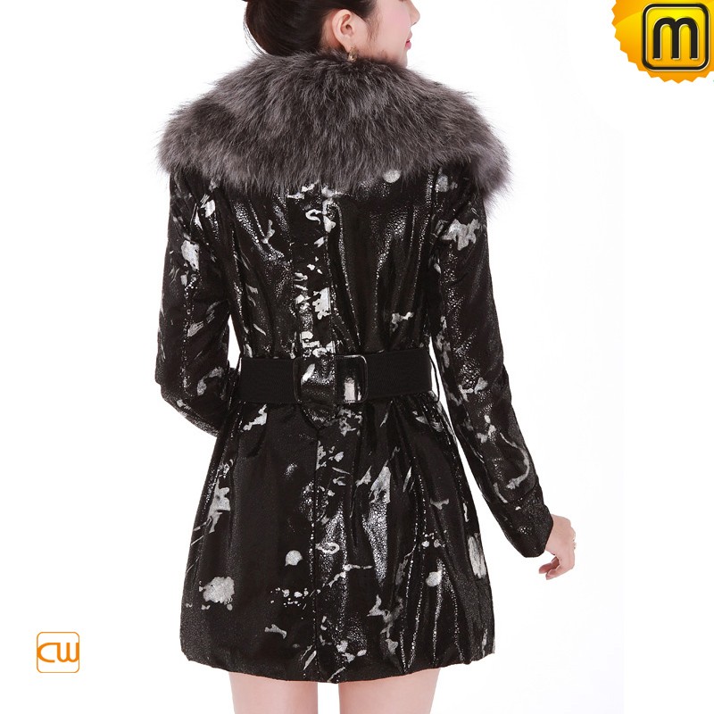 Women's Designer Embossed Sheepskin Leather Coat Raccoon Fur Collar CW692902